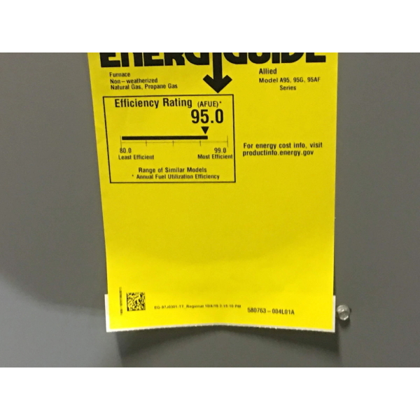 Marca ALLIED de 132,000 BTU upflow/horizontal gas furnace; Efficiency: 95%, Volts: 220V, Hertz: 50, Phase: 1, CFM: 2330, Stage: single, Speed: variable, Motor Type: ECM, BTU Input: 132,000, BTU Output: 129,000, Dimensions: 33″H x 24-1/2″W x 28-1/2″D, Weight: 187 lbs